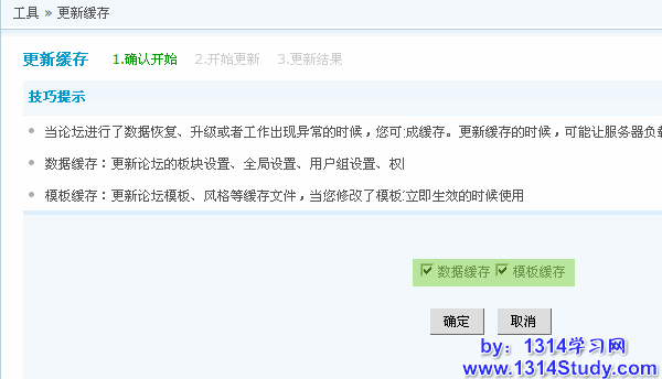 管理员可以更新数据缓存或者模板缓存,也可以同时更新二者。选定对象,然后点击“确定”按钮,即开始更新缓存。