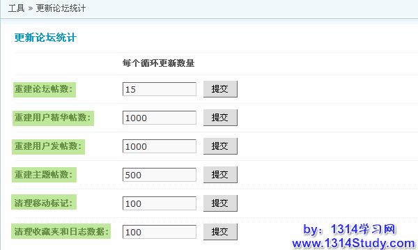 这就是以上六个项目的主要功能,那么更新统计之前,都有每次循环更新数量的设置,这个设置主要是为了防止一次更新太多,完成时间太长,导致服务器超时而设置的,这样每次执行你设置的数目,然后自动跳转,分批执行。