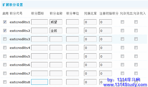 Discuz! 提供了8种扩展积分,站长可以灵活定义每种扩展积分的基本属性,包括:启用此积分,扩展积分图标,扩展积分名称,扩展积分单位,积分兑换比例,注册初始积分,允许兑出,允许兑入。