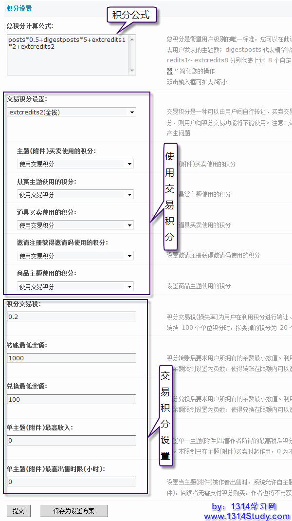 交易积分是一种可以由用户间自行转让、买卖交易、发布悬赏主题的积分类型,站长必须指定一种积分作为交易积分。如果不指定交易积分,用户间的积分交易功能将不能使用。注意:交易积分必须是已启用的积分,一旦确定请尽量不要更改,否则以往记录及交易可能会产生问题。