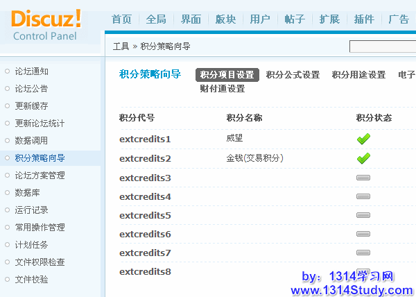 Discuz! 论坛的积分设置非常灵活及详细,在“论坛后台 => 工具 => 积分策略向导”能够完成论坛所有的积分设置,打开积分策略向导页面