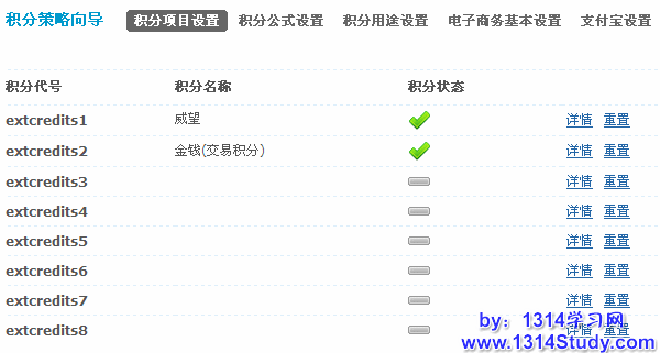 本页面可以查看到扩展积分的启用情况,还可进入详情设置每个扩展积分,可通过重置的功能把所有用户的相应扩展积分设置为 0 。