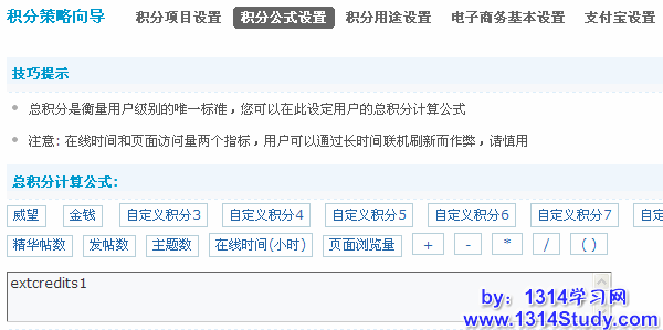 Discuz!论坛的积分分为总积分和扩展积分,总积分是衡量用户级别的唯一标准,总积分是由扩展积分计算得到,此处就可设置扩展积分到总积分的计算公式(可以使用加减乘除等运算)。