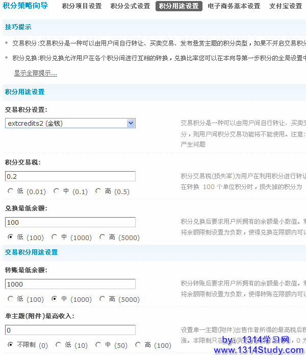 用户在论坛获得积分后可以使用这些积分,此处就是针对用户使用积分做的一些设置。详细设置如下: