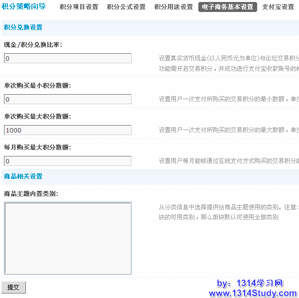 此处是针对会员通过接口进行积分充值的设置,会员可以通过支付宝等把现实的货币兑换成论坛的积分。可设置的项目有:现金/积分兑换比率、单次购买最小积分数额、单次购买最大积分数额、每月购买最大积分数额、商品主题内置类别。