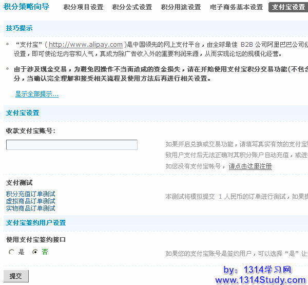 Discuz! 论坛默认是带有支付宝有关的接口,如果开启兑换或交易功能,请填写真实有效的支付宝账号,用于收取用户以现金兑换交易积分的相关款项。如账号无效或安全码有误,将导致用户支付后无法正确对其积分账户自动充值,或进行正常的交易对其积分账户自动充值,或进行正常的交易。