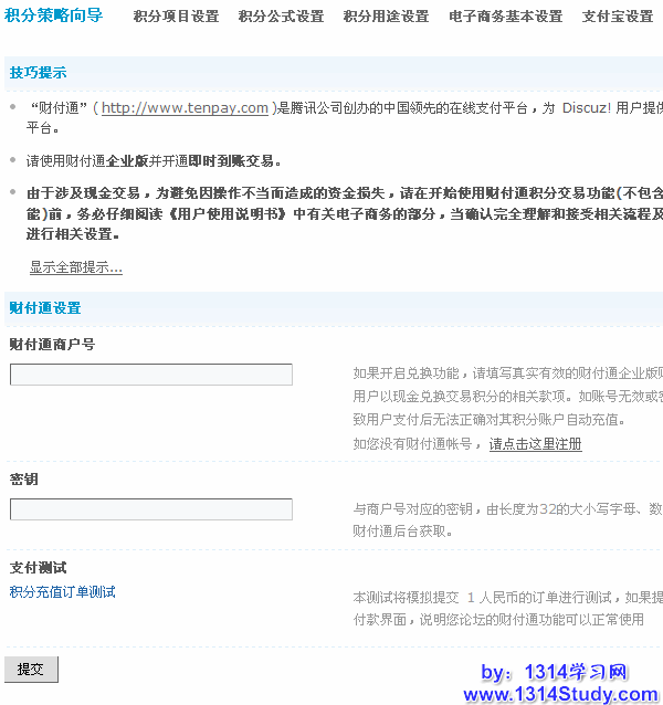 Discuz! 论坛也带有财付通有关的接口,如果开启兑换或交易功能,请填写真实有效的财付通商户号,用于收取用户以现金兑换交易积分的相关款项。如账号无效或安全码有误,将导致用户支付后无法正确对其积分账户自动充值,或进行正常的交易对其积分账户自动充值,或进行正常的交易。