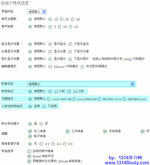 除后台默认的时间设置,用户可在“前台 => 个人中心 => 论坛个性化设定”设置自己访问论坛时的时间显示效果