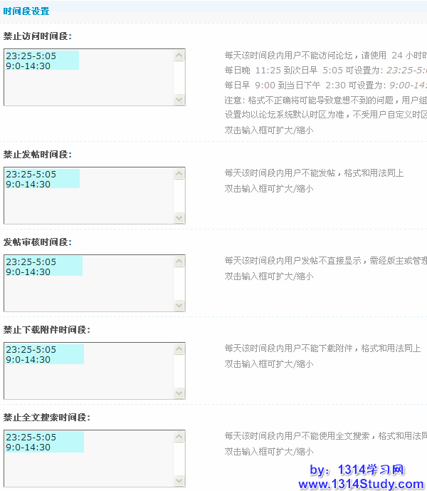 4)禁止下载附件时间段:禁止用户下载论坛附件的时间段设置;