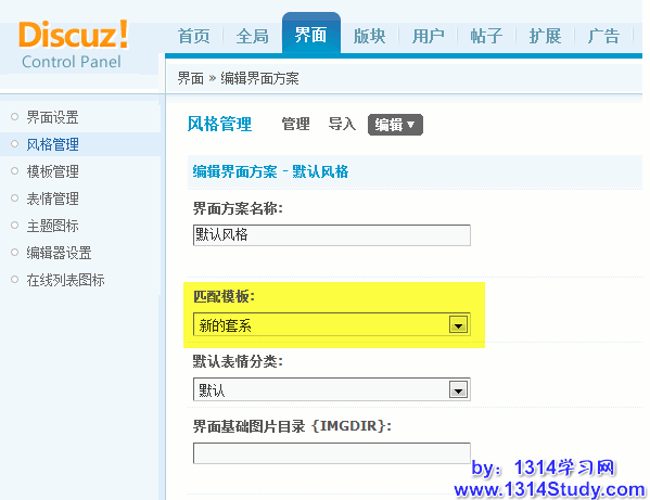 以管理员身份登录网站后台 => 界面 => 风格管理,点击默认风格的编辑按钮,进入编辑面板。找到“匹配模板”,将其设置为上一篇创建的“新的套系”,然后提交保存。如下图所示: