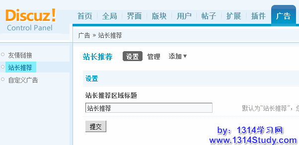 “站长推荐”在后台的设置位置为:Discuz! 7.1 后台 => 广告 => 站长推荐
