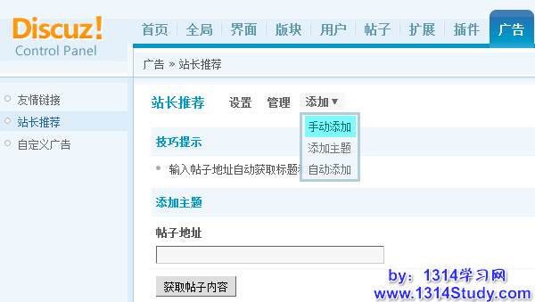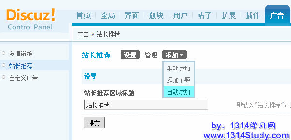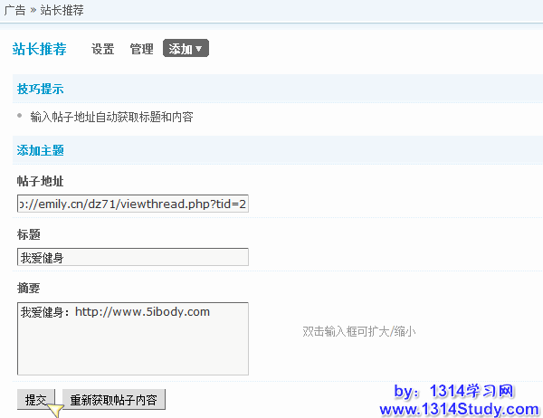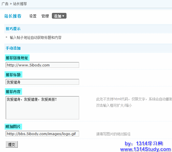 输入“推荐链接地址”、“推荐标题”、“推荐内容”和“附加图片”,然后“提交”即可手动添加一条站长推荐。