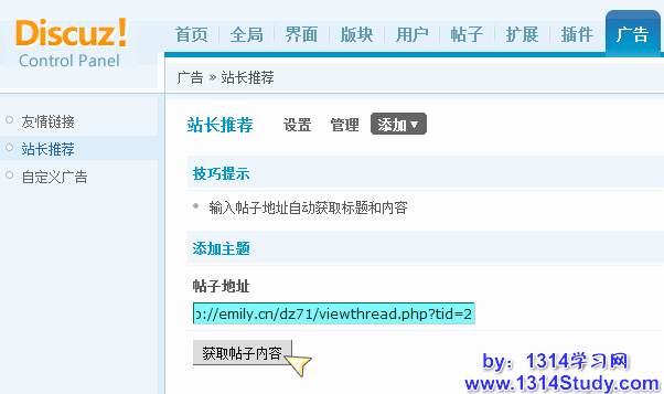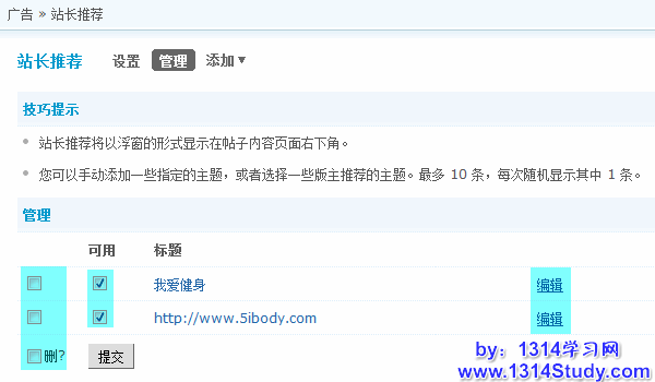 所有被设置为站长推荐和曾经设置为站长推荐的主题都会在此显示,管理员可以在此设置一些主题为站长推荐也可以取消其站长推荐的身份,还可以编辑这些主题,或者将这些主题删除出站长推荐。