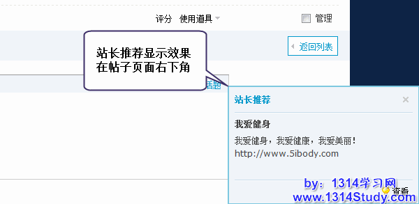 Discuz! 7.1 新增站长推荐功能,管理员可以设置一部分帖子为“站长推荐”,被设置为“站长推荐”的这些帖子就会在帖子内容页面右下角以浮动窗口的形式展示给浏览者,如果有多个主题被设置为“站长推荐”则随机轮流显示。