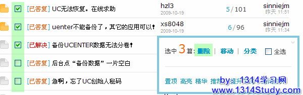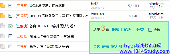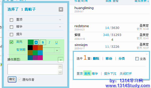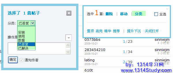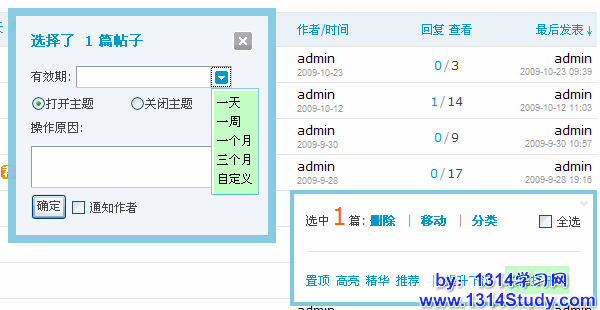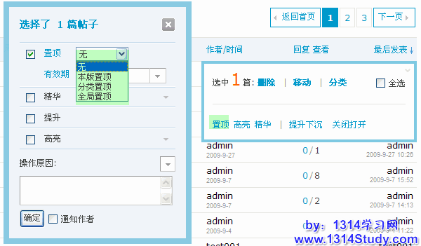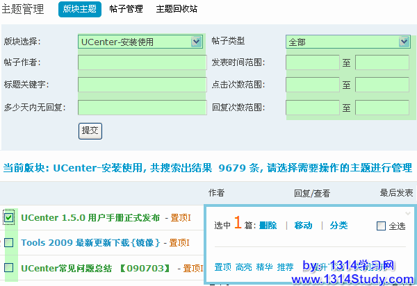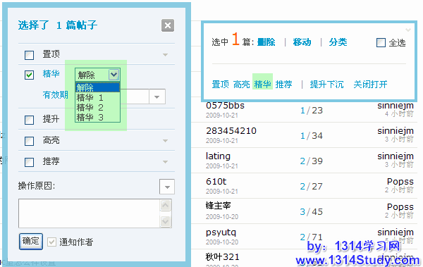 这里可以操作的管理选项有:删除主题、移动主题、主题分类、(置顶/解除)置顶、高亮(显示)、(加入/解除)精华、推荐(主题)、提升/下沉(主题)、关闭/打开(主题)。其中,推荐主题必须要在后台开启后,才会显示。此处可以对主题逐一操作,也可以批量操作。