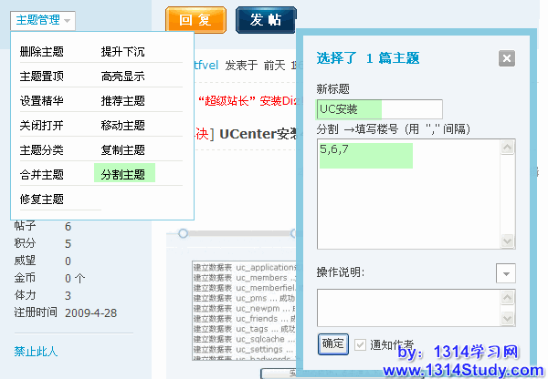 “分割主题”功能主要用来把某个主题的部分帖子分割出来作为一个新的主题,如下图所示: