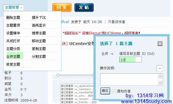 操作方法:进入帖子页面,在左上角的“管理选项”中点击“合并”,在“主题tid”那里填写即将与当前主题合并的 tid,合并后的主题为当前主题,与当前主题进行合并的主题变为当前主题的回复。如下图所示: