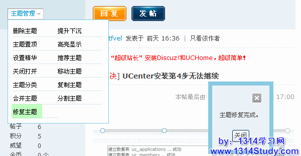 有的时候我们查看某个帖子的时候发现这个帖子的一些回复打不开等等一些情况,这个时候我们就可以通过“修复主题”功能使该主题恢复正常。进入帖子页面,在左上角的“管理选项”中点击“修复主题”,如下图所示: