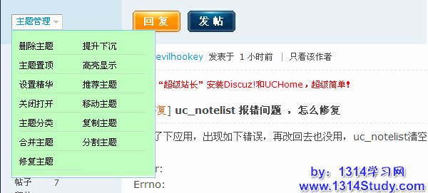 2、帖子页面的管理选项,如下图所示:
