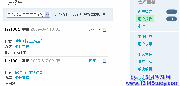 管理员或者版主用来查看论坛用户报告的帖子记录,如下图所示: