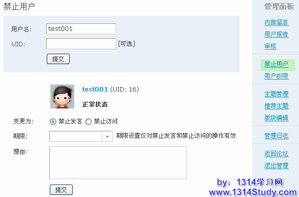 管理员或者版主用来禁止用户发言或者访问,如下图所示