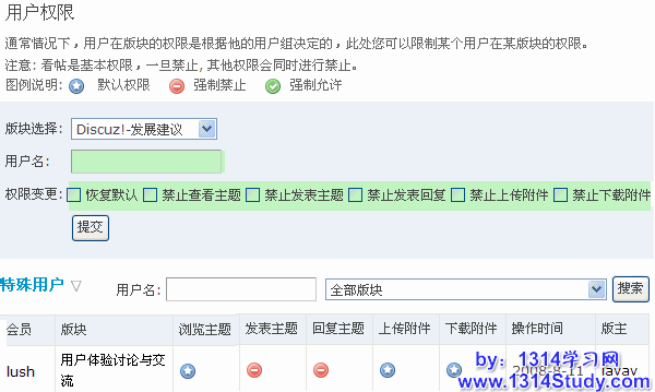 通常情况下,用户在版块的权限是根据他的用户组决定的,此处管理员或版主可以限制某个用户在某版块的权限。如下图所示: