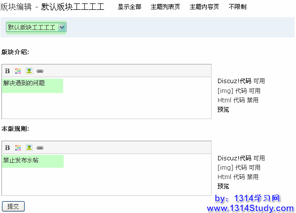 管理员或者版主用来设置版块介绍和本版规则,其中,本版规则需要在论坛后台开启后,版主才可编辑。如下图所示: