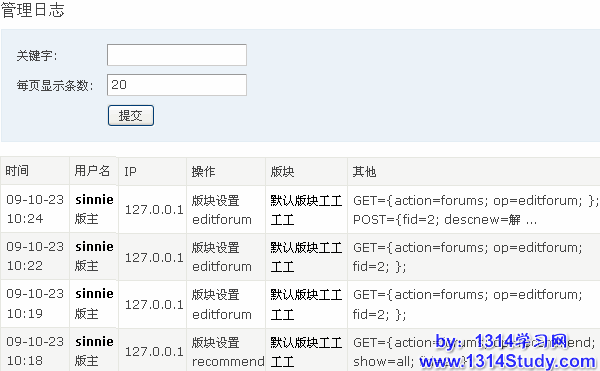 管理员或版主用来查询哪些管理员或者版主对论坛进行了什么管理操作,如下图所示: