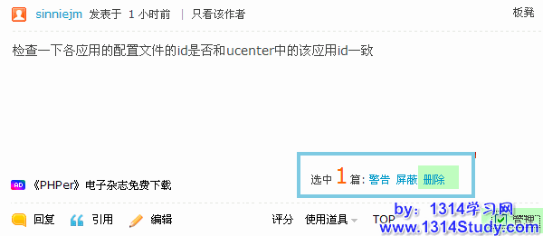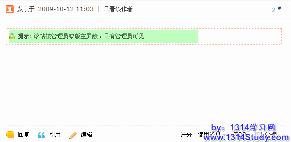 使用方法类似于“删除回帖”操作,在帖子右下角的多选框选中要屏蔽的帖子,在帖子页面右下角的“管理选项”里选择“屏蔽(帖子)”,则该帖子被屏蔽,被屏蔽的帖子内容只有管理员能看到,帖子作者本人和其他会员都看不到帖子内容,如下图所示: