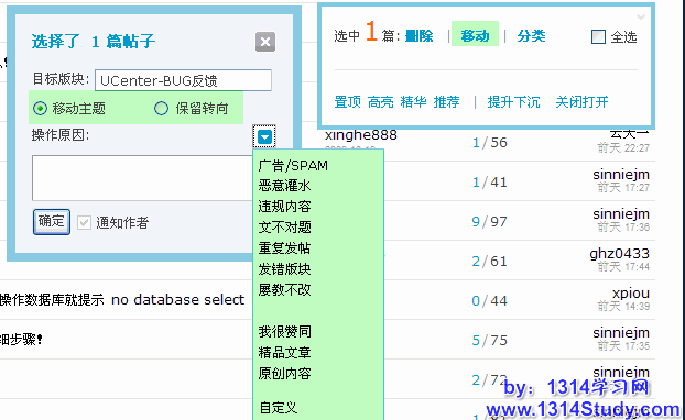 需要提一下的是,操作页面针对移动方式有两个选项:移动主题、移动主题并在原来的版块中保留转向。如下图所示: