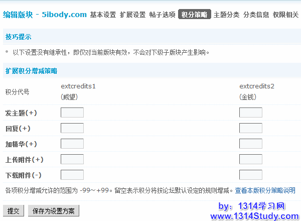 各项积分增减允许的范围为 -99~+99。留空表示积分将按论坛默认设定的规则增减。