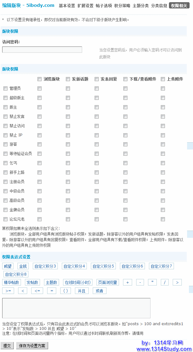 当您设定了权限表达式后,只有符合此表达式的会员才可以浏览本版块。如“posts > 100 and extcredits1 > 10”表示“发帖数 > 100 并且 威望 > 10”