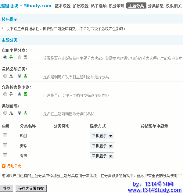 您可以启用已有的主题分类或添加新主题分类应用于本版块,在分类很多的情况下,建议只有重要的分类使用“平板显示”方式,更多的分类使用“下拉显示”方式。