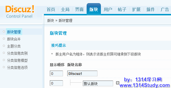 在版块管理界面,版主用户名为粗体,则表示该版主权限可继承到下级版块。