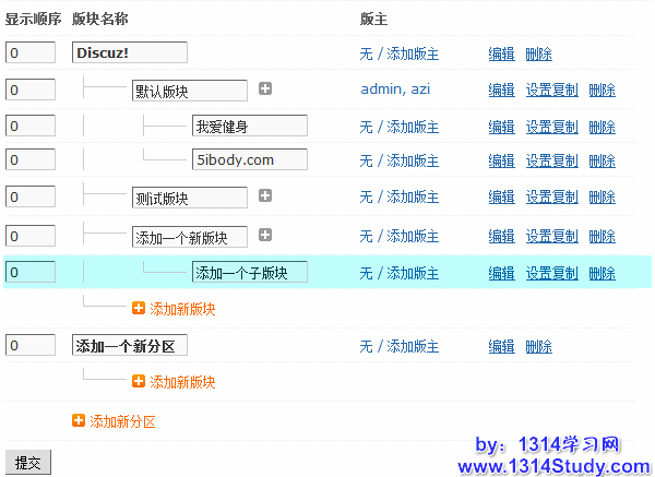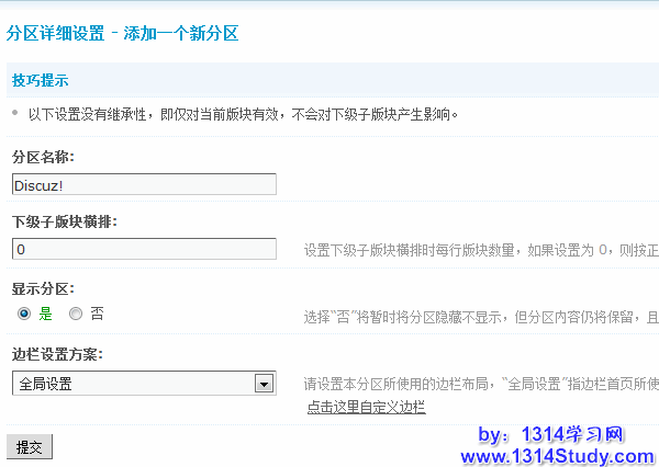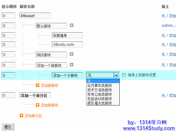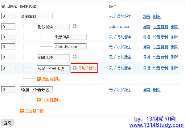 弹出输入框,输入子版块名称,选择版块设置方案,以及选择是否继承上级版块设置,然后点击“提交”即可: