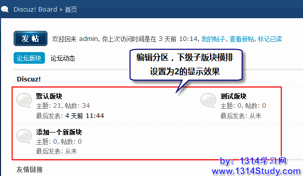 下级子版块横排:设置下级子版块横排时每行版块数量,如果设置为 0,则按正常方式排列。