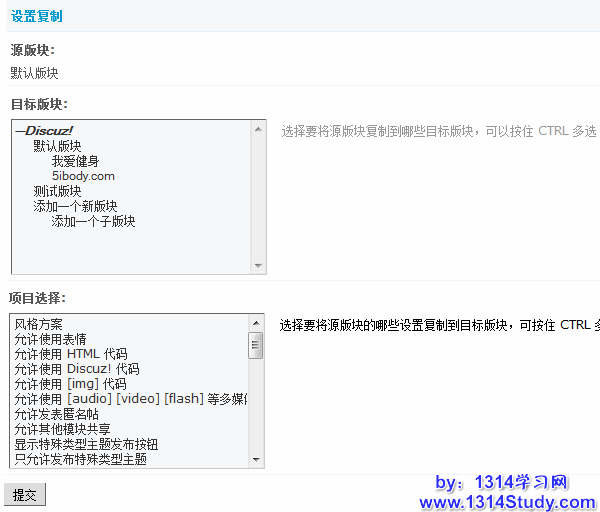选择要将源版块复制到哪些目标版块,可以按住 CTRL 多选,可以是版块或者子板块。
