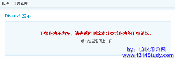 删除分区或版块前必须先删除该分区或版块下的子版块,否则会提示:“下级版块不为空,请先返回删除本分类或版块的下级论坛”。