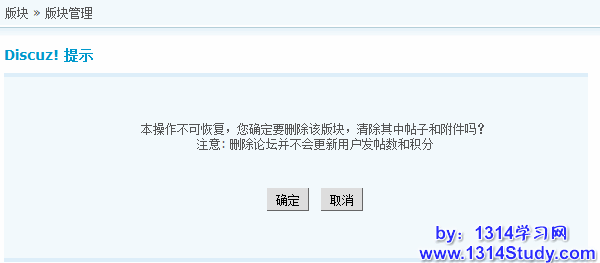 删除没有子版块的分区或者版块会提示:“本操作不可恢复,您确定要删除该版块,清除其中帖子和附件吗?注意: 删除论坛并不会更新用户发帖数和积分”。