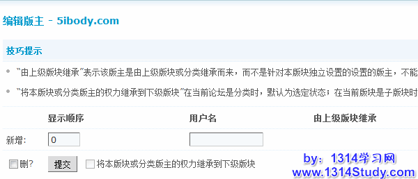 在“用户名”一栏输入用户名,点击“提交”即可将该用户添加为该版块的版主,同时该用户就拥有了该版块版主的一切权限。
