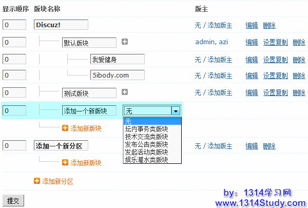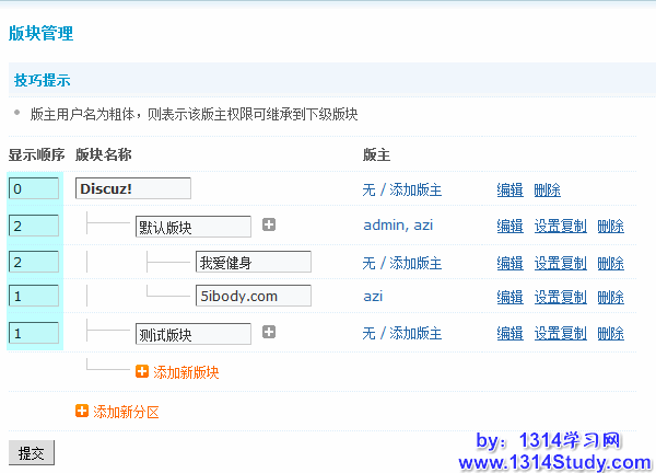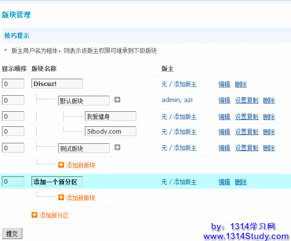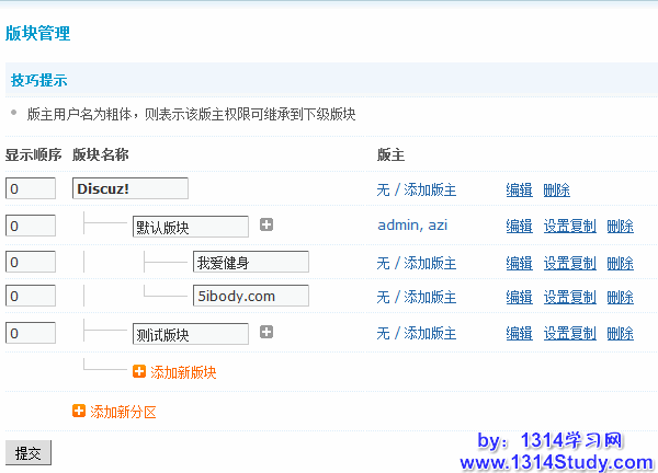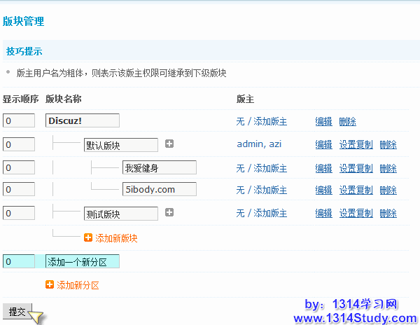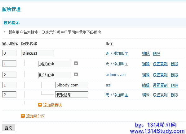 版块管理设置方面站长管理各个版块,其管理操作包括添加新版块、编辑版块、复制版块设置、删除版块、添加版主、以及设置各个版块的显示顺序。