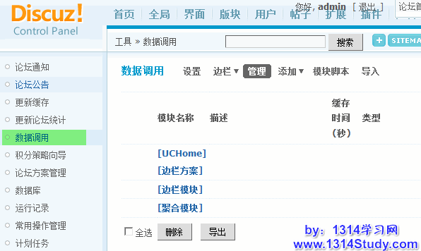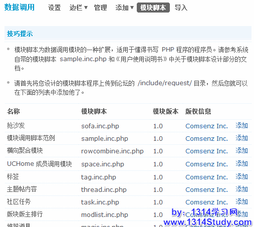 其他模块脚本的调用方法与此类似,则不再赘述。需要特别说明的是,“自由代码”脚本,可以自由书写 HTML、Discuz! 代码,所以需要添加自定义代码的调用则添加此模块脚本的调用即可。