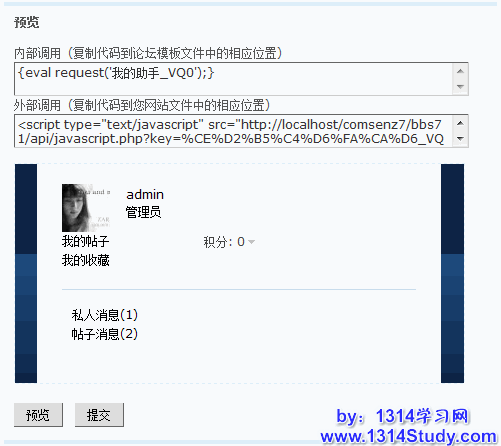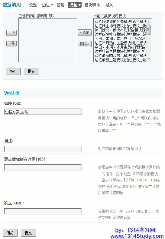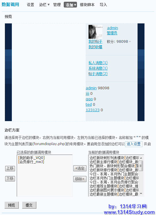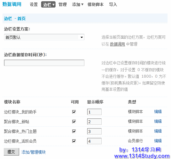 可以从边栏设置方案中选择一个现有的论坛方案,也可以直接勾选下方模板列表中需要显示的调用模块,设置好之后,点击“提交”即可成功设置首页的边栏。如下图所示: