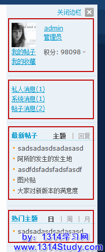 边栏是出现在首页或主题列表页面右侧的信息栏,边栏中显示的信息由边栏方案提供,边栏方案则是把创建好的论坛调用添加进去,按照每个调用的先后顺序排列显示的集合。