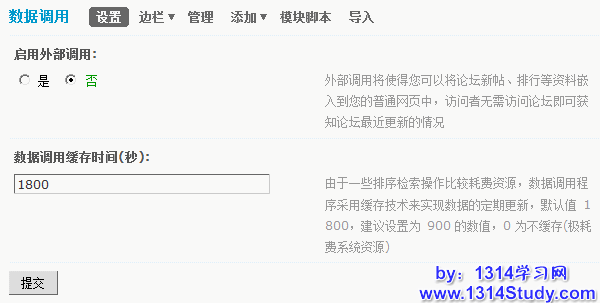 数据缓存时间(秒):由于一些排序检索操作比较耗费资源,数据调用程序采用缓存技术来实现数据的定期更新,默认值 1800,0 为不缓存(极耗费系统资源)。如果留空则使用基本设置的值。