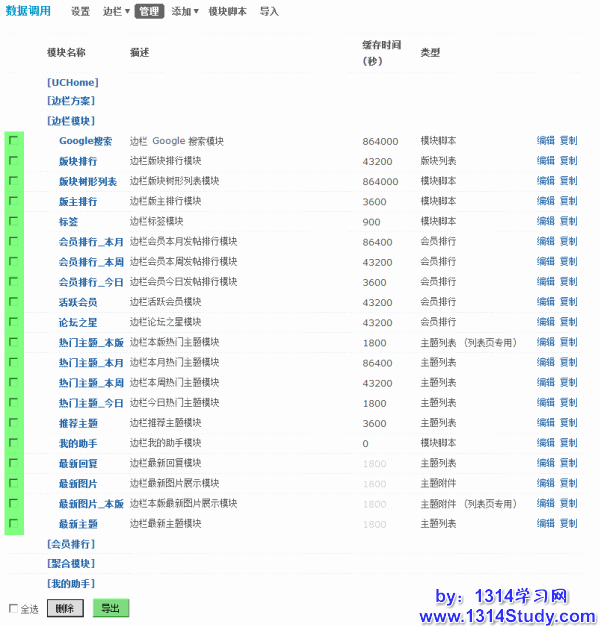 其他调用,如主题列表、版块列表、论坛统计、主题附件、自定义的调用方法同会员排行的调用方法类似,则不再赘述。需要特别说明的是,“自定义”调用,可以自由书写 HTML 代码,也可以将已添加的调用插入到自定义调用中,形成灵活的调用方式,所以需要添加自定义代码的调用则添加此调用即可。