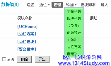 点击导航上面的“添加”,会出现下拉菜单,里面包括了所有可以创建的调用项目:主题列表、版块列表、会员排行、论坛统计、主题附件、边栏方案、自定义,如下图所示: