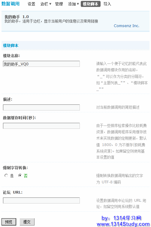 然后点击“提交”,则创建完成一个模块脚本的调用。可以点击导航上的“管理”查看刚才添加的调用。