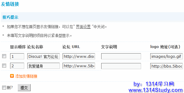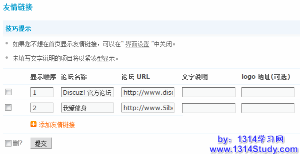 上图中可以看到系统默认自带一个 Discuz! 官方站点的友情链接。