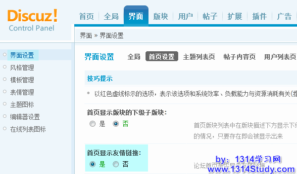 如果您不想在首页显示友情链接,可以在“Discuz!7.0.0 后台 => 界面 => 界面设置 => 首页设置”中关闭: